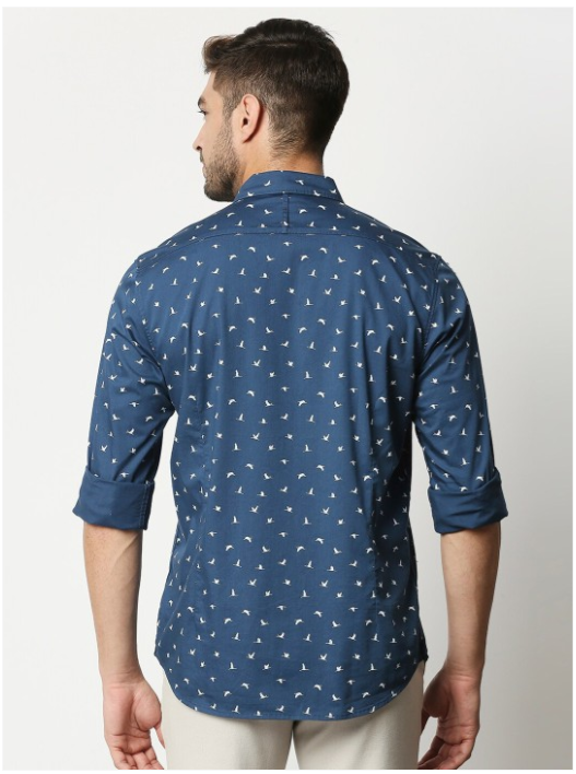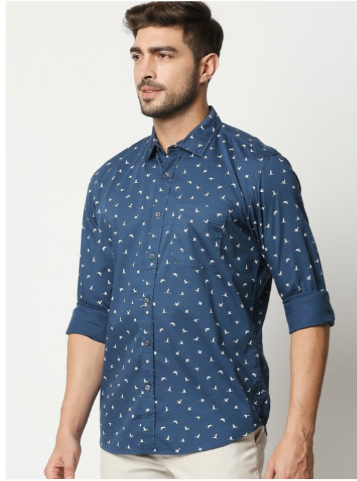 Blue conversational printed opaque casual shirt ,has a spread collar, button placket, 1 pocket, long regular sleeves, curved hem