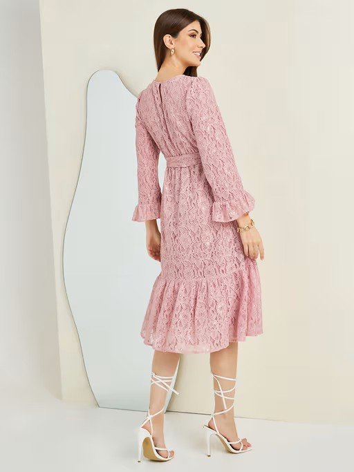 Mauve Lace Detail Tie Up Front Midi Dress With Belt (Set of 2)