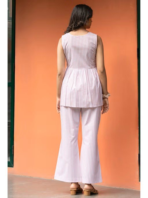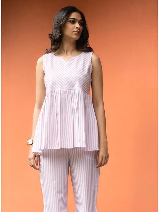 Step Into Effortless Summer Elegance with The Baby Pink Notched Neck Top. Made From Premium Pure Cotton, This Sleeveless Design Features A Classic Stripe Print and A Chic Notched Neckline. With Pockets On Both Sides, It Perfectly Combines Style and Practicality for The Season.