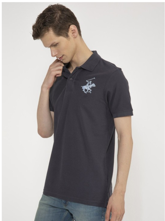 Black solid T-shirt, has a polo collar, and short sleeves