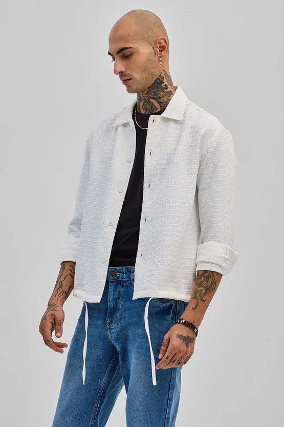 Men Slim Fit Self Design Spread Collar Casual Shirt