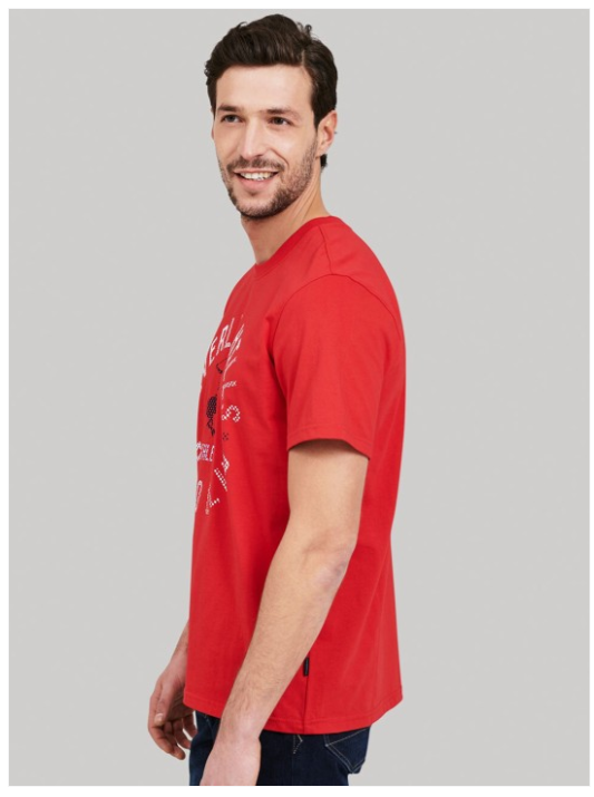 Red printed T-shirt, has a round neck, and short sleeves