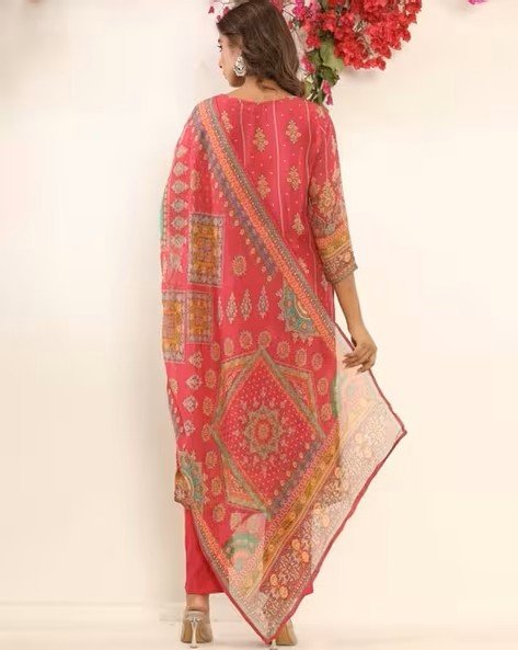 Adorned with detailed floral and paisley-inspired prints throughout the kurta and dupatta, offering a rich ethnic aesthetic.