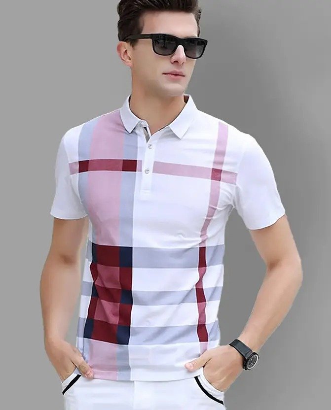 Men Striped Polo Neck Cotton Blend White, Maroon T-Shirt