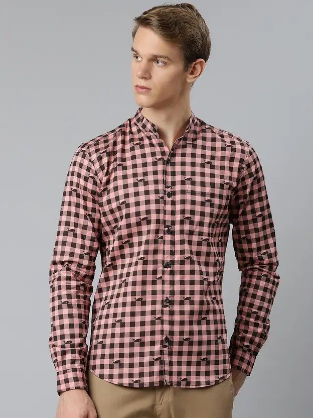 Men Regular Fit Checkered Mandarin Collar Casual Shirt