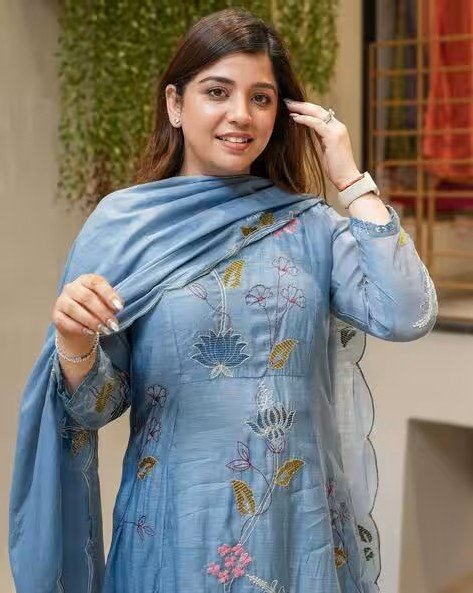 Step into elegance with this beautiful 3-piece ethnic set featuring a pastel Blue Anarkali-style kurta adorned with multicolor floral thread embroidery. The kurta is crafted in a breathable fabric that ensures all-day comfort while the vibrant floral patterns add a refreshing, graceful charm.