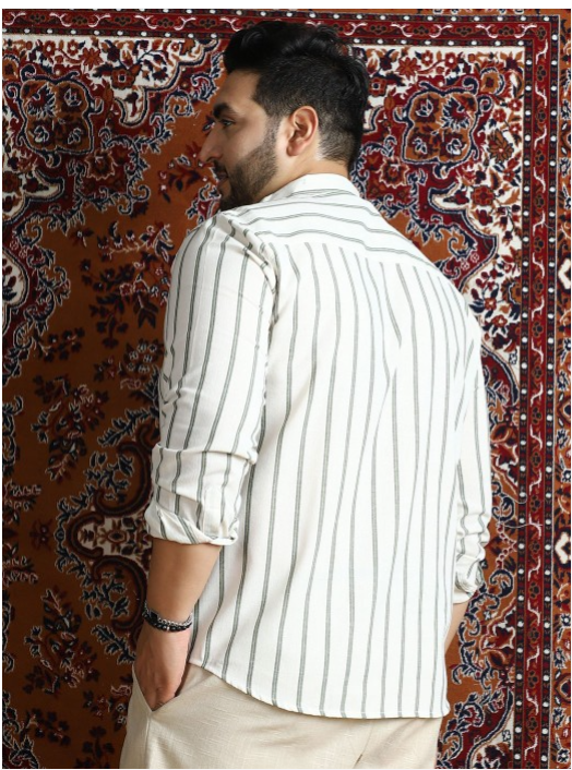 White and black vertical stripes striped opaque casual shirt ,has a mandarin collar, button placket, long roll-up sleeves, curved hem