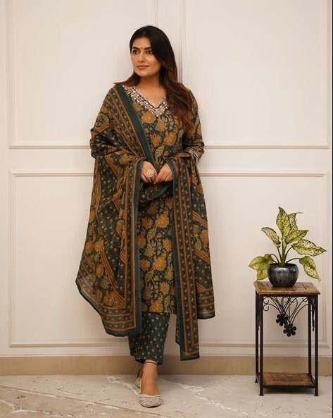 Women Floral Print Straight Kurta with Pants & Dupatta