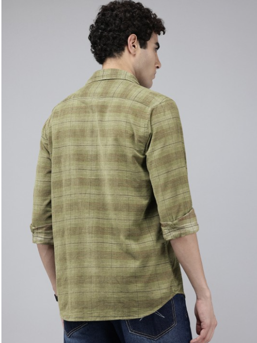 Green other checks opaque casual shirt ,has a spread collar, button placket, 1 patch pocket, long regular sleeves, curved hem