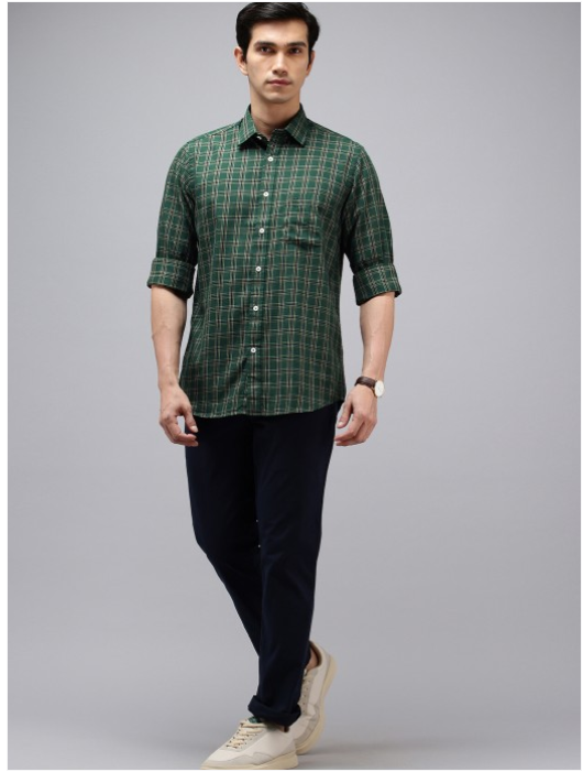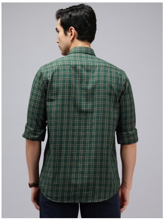Green tartan checked opaque casual shirt ,has a spread collar, button placket, 1 patch pocket, long regular sleeves, curved hem