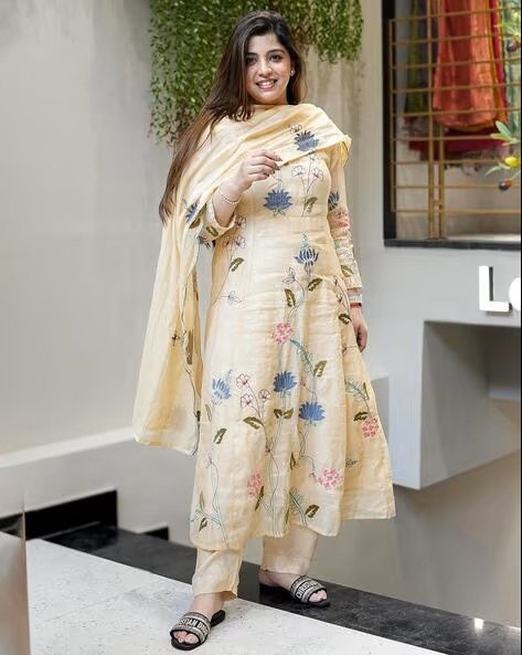 Kurta: Anarkali-style, full sleeves, round neck, multicolor floral thread embroidery, mid-calf length. Bottom: Straight-fit pants in a matching cream tone. Dupatta: Lightweight with minimal embroidery to complement the kurta.