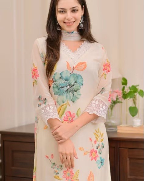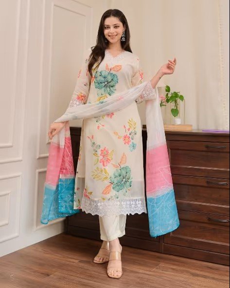 Top Design: Soft cream base adorned with vibrant floral prints in shades of teal, pink, and orange. Features delicate lace detailing at the hemline for a graceful touch. Dupatta Design: Lightweight and flowy dupatta with coordinated floral motifs and a stunning pink & blue colorblock border, adding a pop of color to the ensemble. Bottom Design: Plain solid matching trousers ensuring maximum comfort and a clean, classic finish.