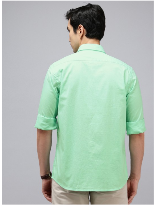 Green textured self design opaque casual shirt ,has a spread collar, button placket, 1 patch pocket, long regular sleeves, curved hem