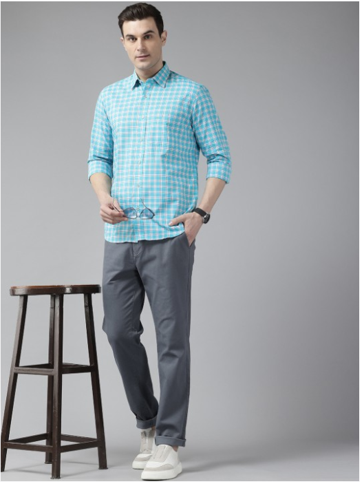 Blue and white checked opaque casual shirt ,has a spread collar, button placket, 1 patch pocket, long regular sleeves, curved hem