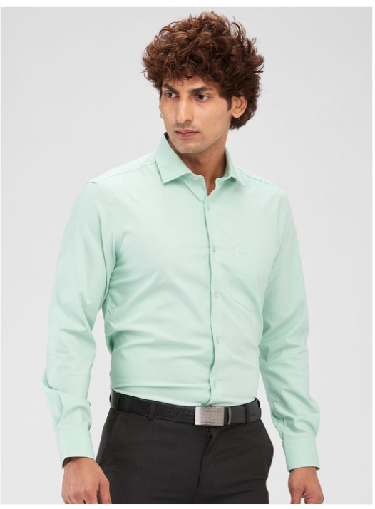 Green solid opaque Casual shirt ,has a spread collar, button placket, 1 patch pocket, long regular sleeves, curved hem
