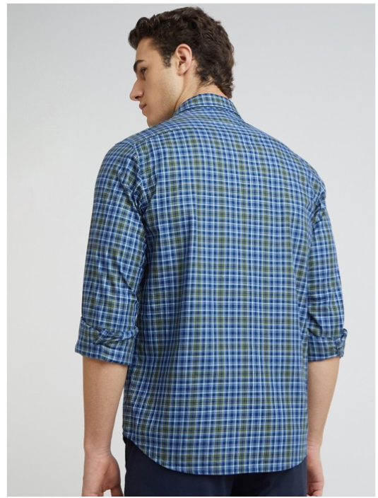 Blue tartan checks checked opaque Casual shirt ,has a spread collar, button placket, na pocket, long regular sleeves, curved hem