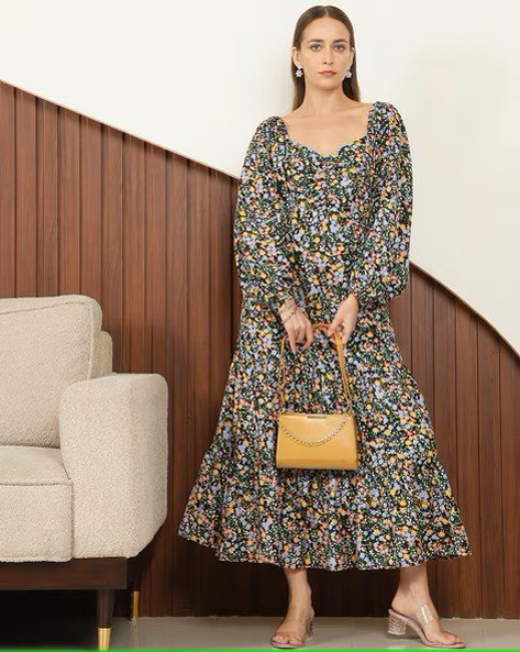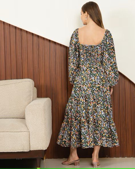 Shein Elegant Balloon Sleeves Sweetheart Neck Back Smocked Tiered Dress
