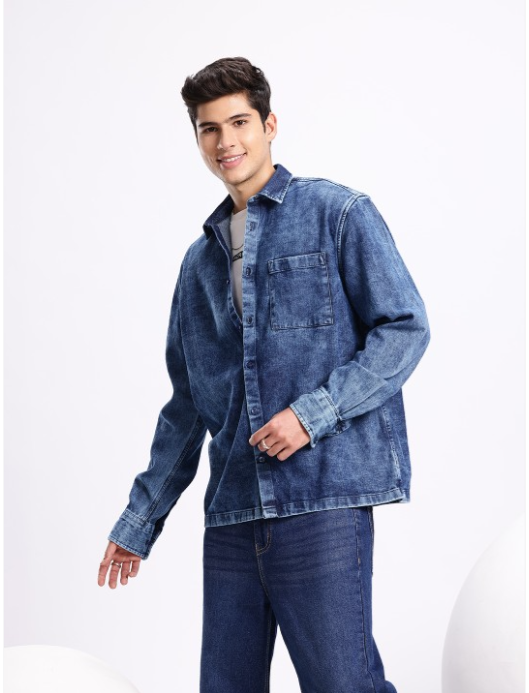 Blue solid opaque casual shirt ,has a spread collar, button placket, 1 patch pocket, long drop-shoulder sleeves, straight hem