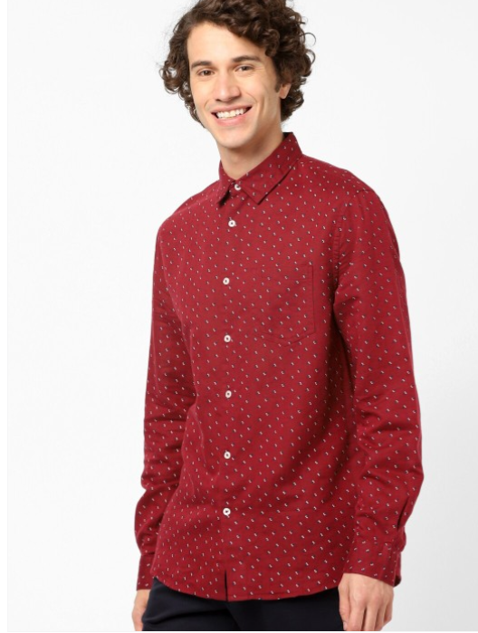 Maroon, blue and white printed casual shirt, has a cutaway collar, long sleeves, button placket, curved hem, and 1 patch pocket