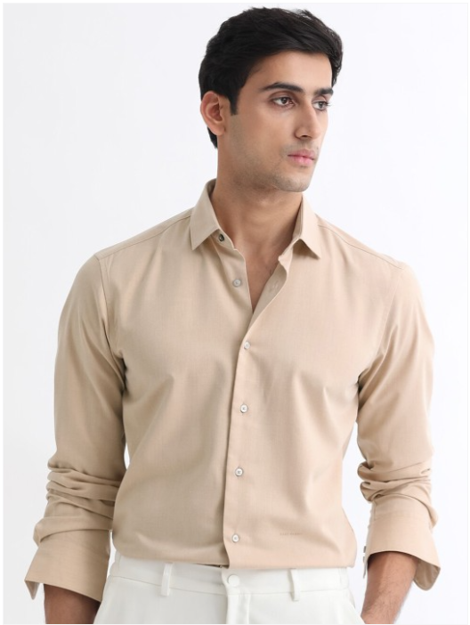 Beige solid opaque casual shirt ,has a spread collar, button placket, long regular sleeves, curved hem