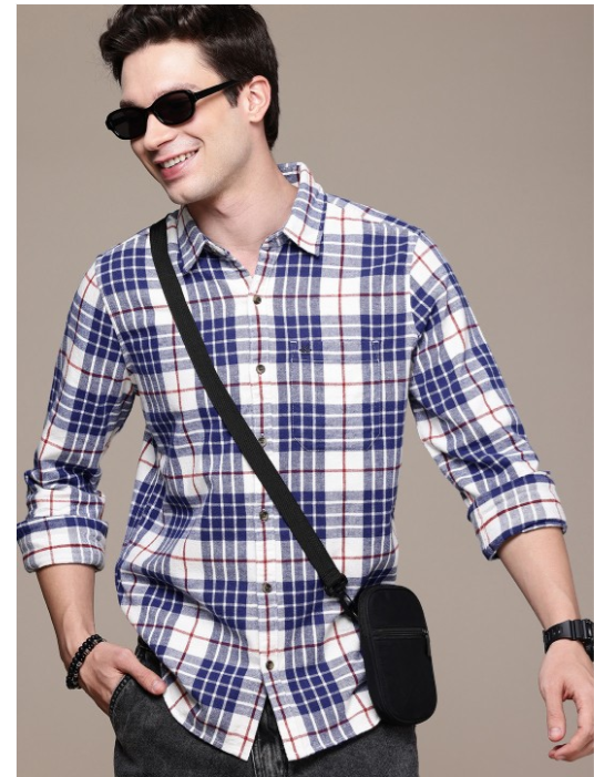 White other checks opaque casual shirt ,has a spread collar, button placket, 1 patch pocket, long regular sleeves, curved hem