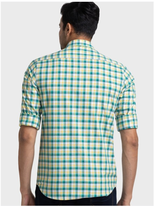 Green, yellow & white other checked casual shirt, has a spread collar, button placket, 1 patch pocket, long regular sleeves, curved hem